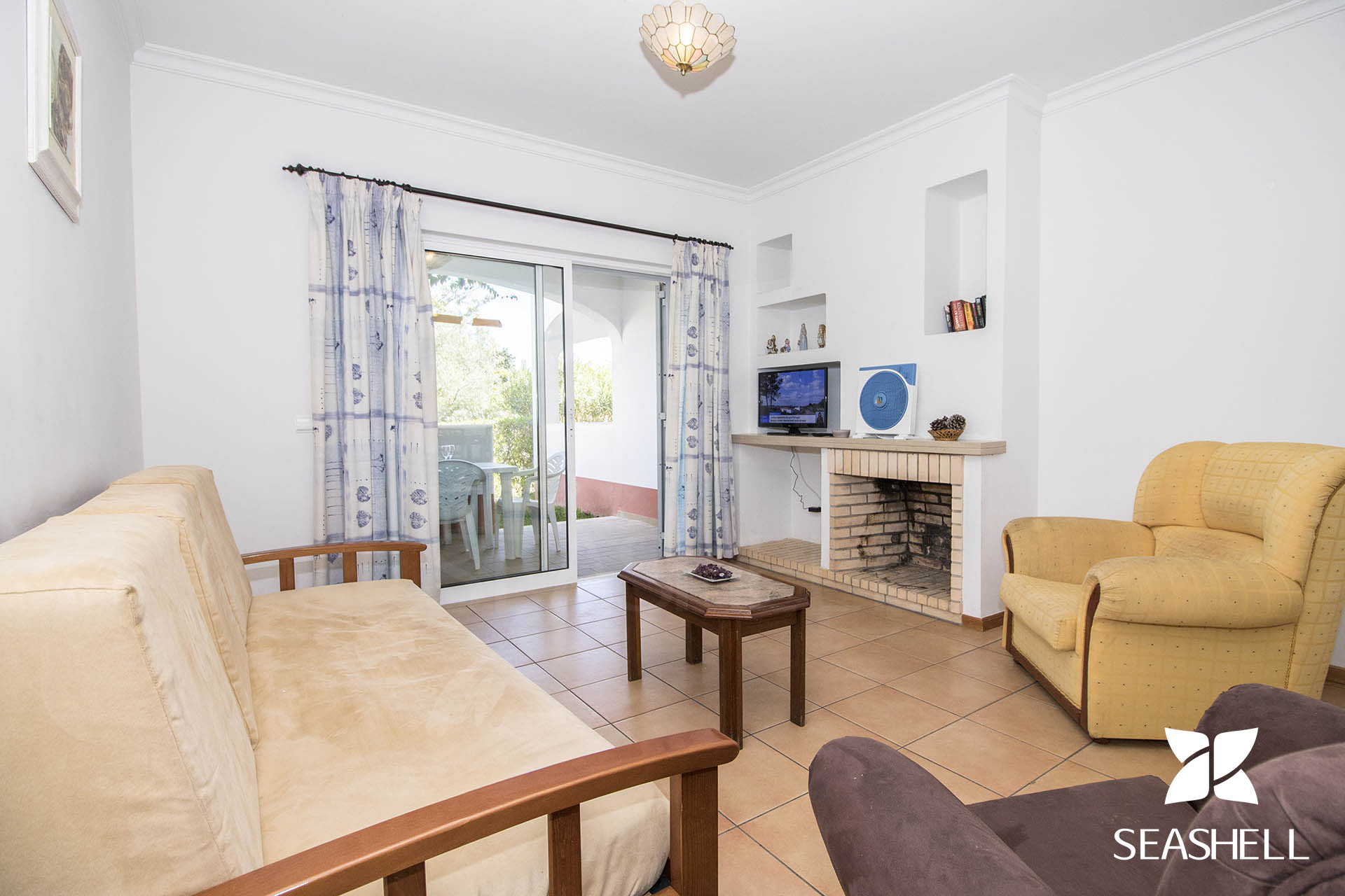 Na sala uma janela de correr leva até uma varanda com uma extensão relvada onde se encontra uma mesa para poder tomar as suas refeições ao ar livre. Esta área conta também com um BBQ a carvão. Este espaço é bastante agradável para usufruir de umas férias em descanso.
