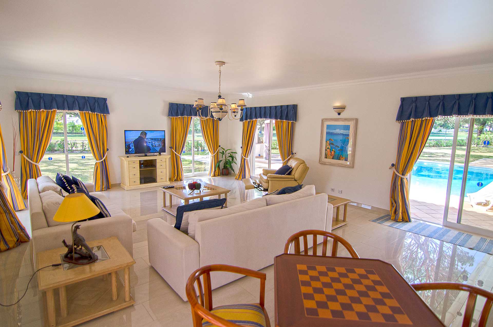 A sala de estar/jantar é luminosa, espaçosa e com uma área de refeições onde uma grande mesa serve as delícias da casa. A zona de estar tem dois sofás e uma poltrona reclinável. A televisão tem canais por cabo e o acesso á internet é por Wi-Fi. Todo este charme é brindado através das várias portas de correr que para além da luz que transmite à casa brinda-nos com uma vista sobre o campo de golfe do Pinhal. A cozinha de amplo tamanho está equipada com todos os eletrodomésticos necessários, desde máquina de café à máquina de loiça e roupa. Para pequenas refeições a cozinha tem também uma mesa e cadeiras.