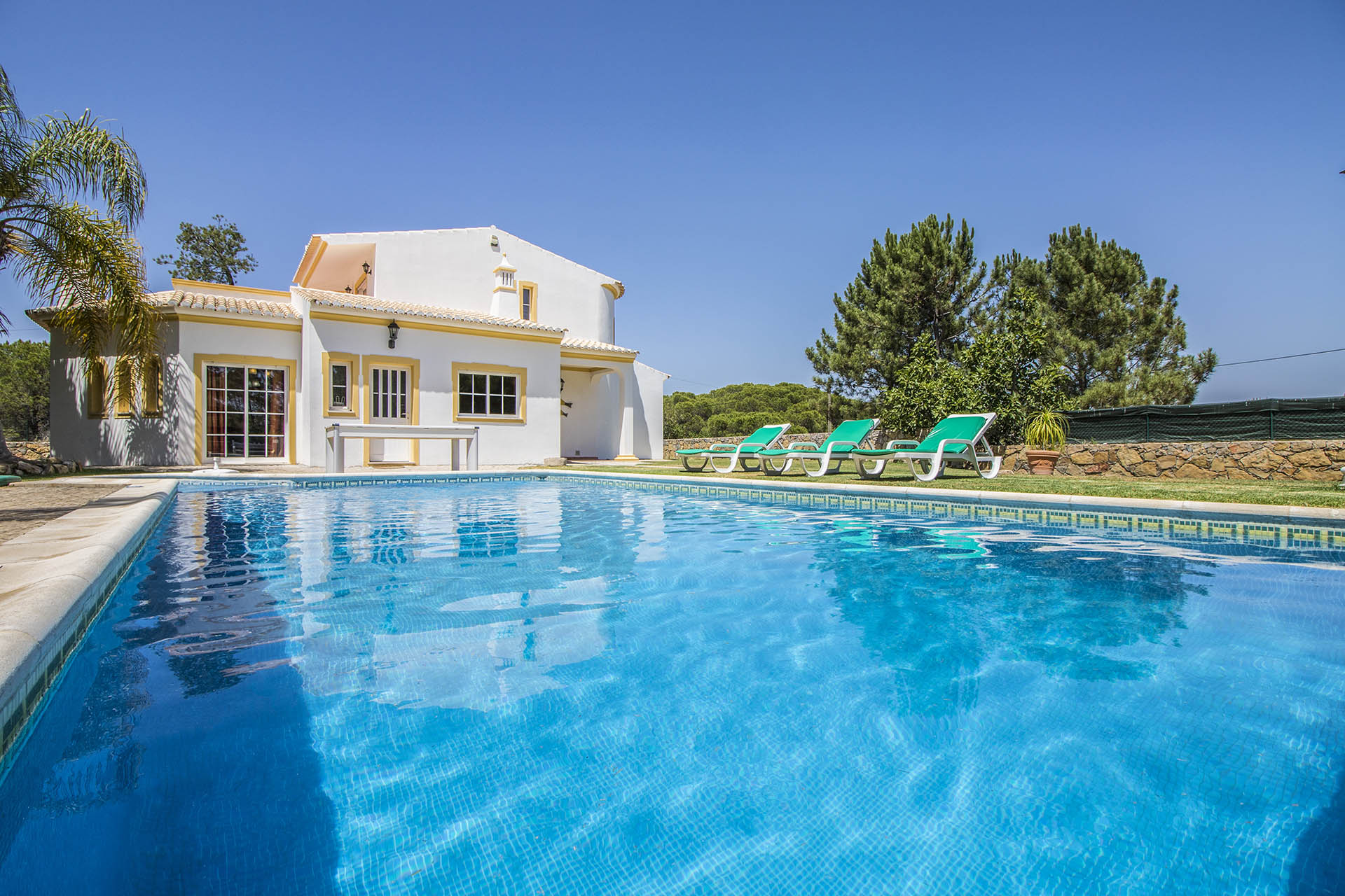 O exterior da moradia é ajardinado e cercado a toda a volta e conta com bastantes sombras refrescantes das árvores adultas espalhadas pelo jardim. A piscina tem 10 metros de comprimento por 4 metros de largura e profundidades entre 1 e 2 metros. A piscina tem a possibilidade de ser aquecida somente entre Abril e Outubro, através de um custo adicional (com um pedido efetuado no mínimo com 48h de antecedência), Contudo se as temperaturas estiverem demasiadamente baixas, poderá não ser possível o fornecimento do serviço.